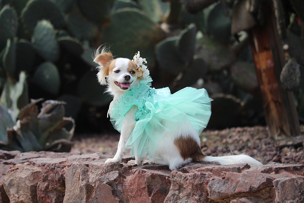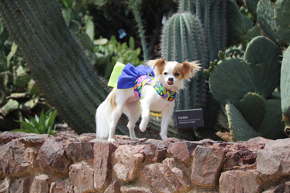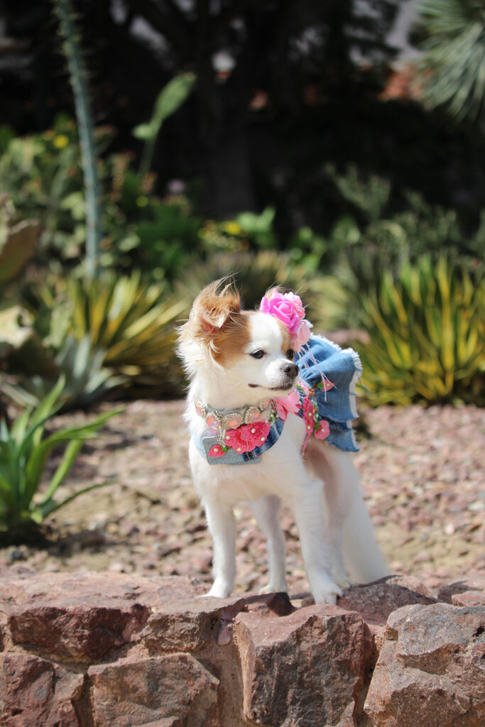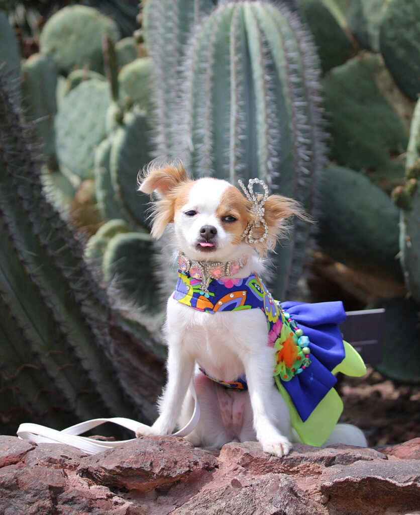 This weekend, fashion model Sophie joined us in the sun-soaked desert of Beverly Hills at the iconic Cactus Garden for a DOGUE Pupchella-themed photoshoot. Surrounded by golden light, sculptural cacti, and soft desert winds, the setting was the perfect backdrop for a day dedicated to high fashion – Desert Edition.