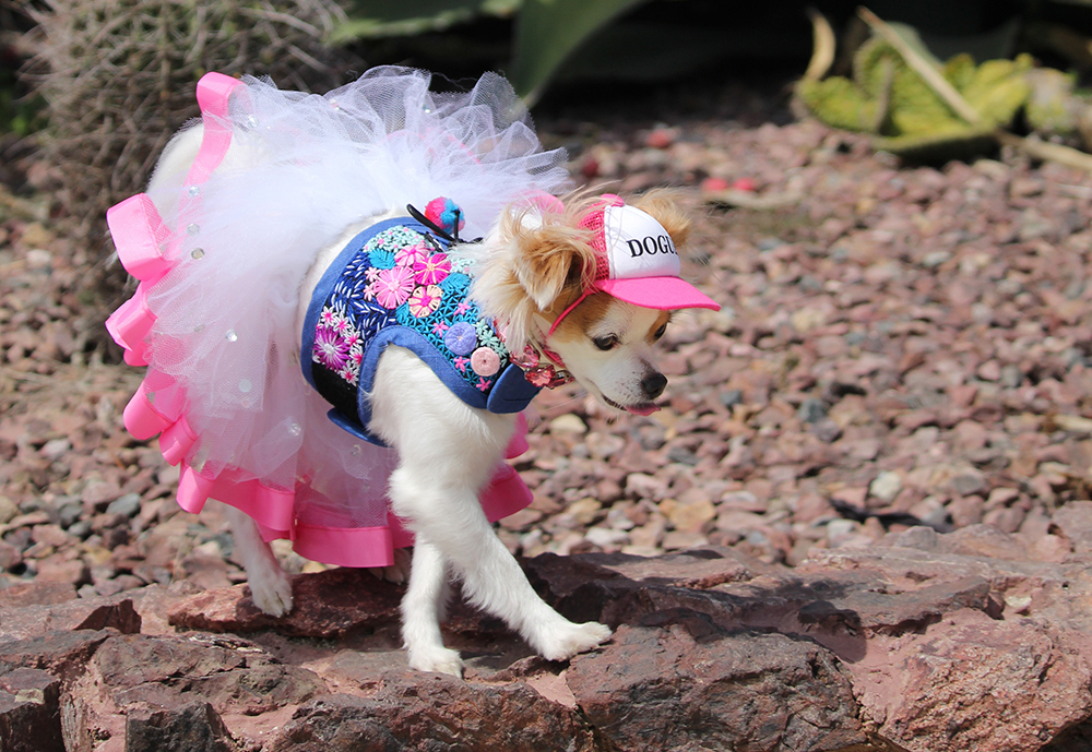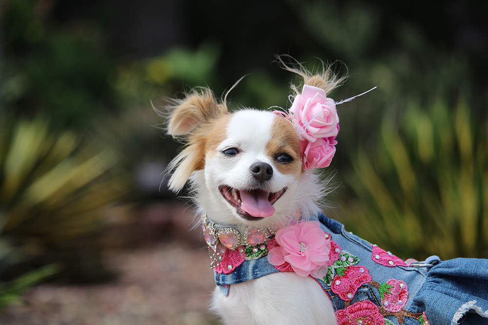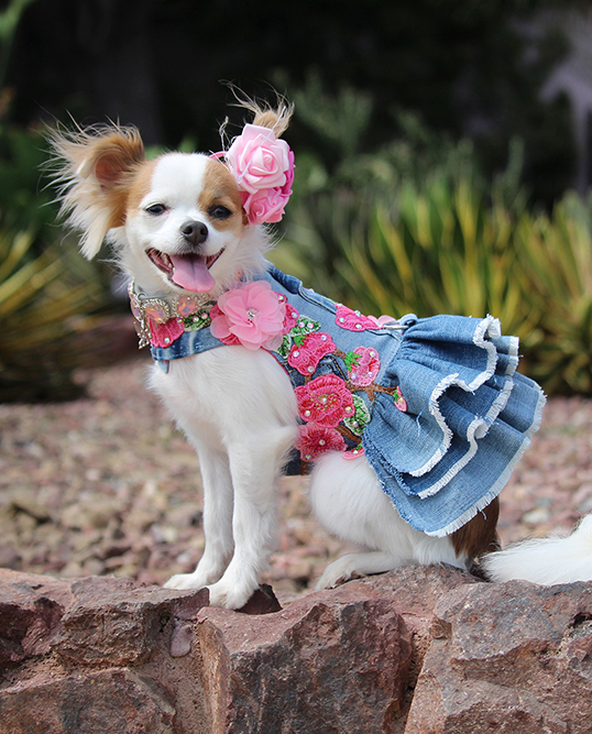 Next came a playful hand-embroidered denim-style floral harness vest from Dog in the Closet, paired with the signature DOGUE hat from the DOGUE X Puplid collection, and finished with a necklace from Maggie & Co.